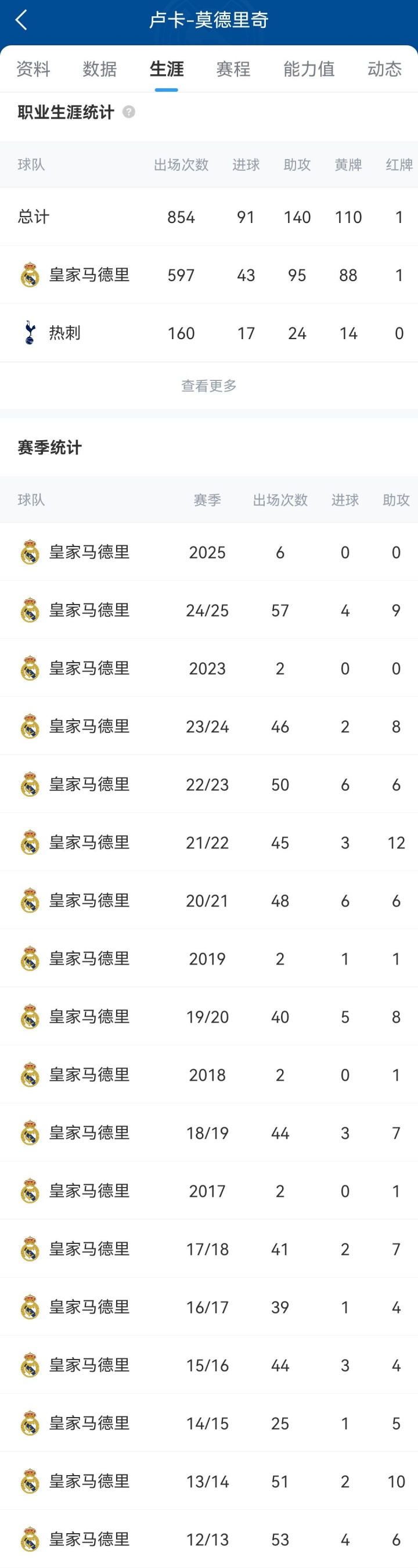 莫德里克(Modric)于2012年加入了皇家馬德里(Real Madrid)。他在13年內(nèi)進行了597場比賽,打進43球并協(xié)助95次比賽,幫助球隊贏得28冠軍獎杯:6個冠軍聯(lián)賽,6個俱樂部世界杯,5個歐洲超級杯,4個La Liga,2杯杯,2杯德爾·埃爾·雷伊和5個西班牙超級杯。